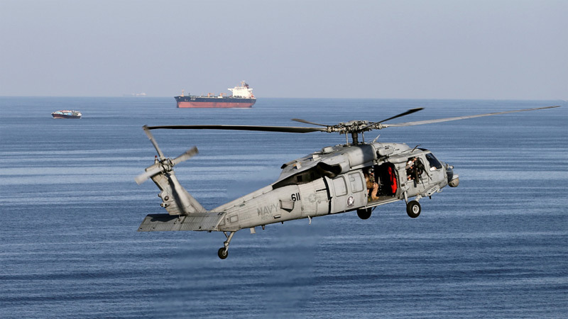 Một trực thăng MH-60S bay gần một tàu dầu khi chiến hạm USS John C. Stennis đi qua Eo Hormuz hồi tháng 12/2018. (Ảnh: Reuters)