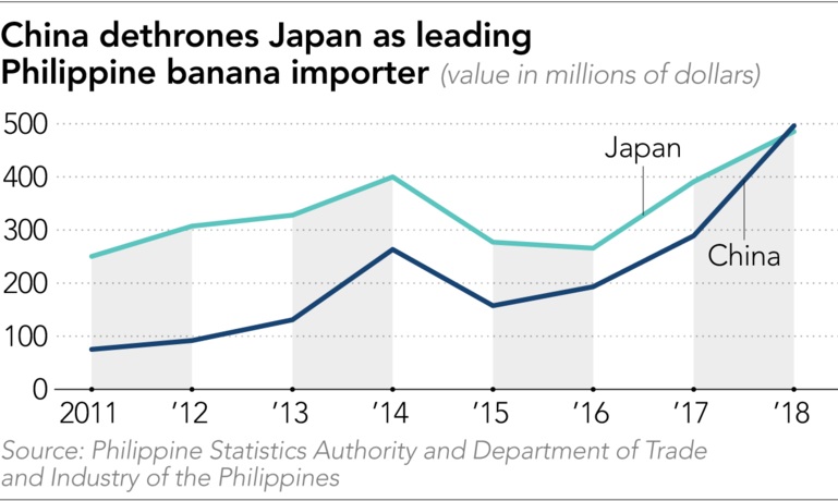 Năm ngoái, Trung Quốc mua 496 triệu USD giá trị mặt hàng chuối của Philippines, tăng 71% so với năm 2017, trong khi các đơn hàng mua chuối Philippines của Nhật Bản xếp sau, 485 triệu USD.