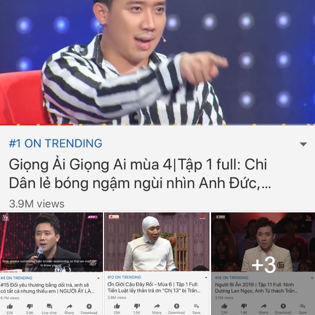 Trên trang cá nhân, Trấn Thành hào hứng tổng kết 6 chương tŕnh có ḿnh tham gia đă cùng vào top được xem nhiều nhất của Youtube Việt Nam. "Không thể tin được! Cùng 1 lúc, 6 chương tŕnh của em làm đều nằm trong top trending của Youtube! "Giọng ải giọng ai", "Người ấy là ai", "Ơn giời cậu đây rồi", "Người bí ẩn", "Hát măi ước mơ", "Chạy đi chờ chi". Con cảm ơn Tổ nghiệp, em cảm ơn quư khán giả thân yêu".