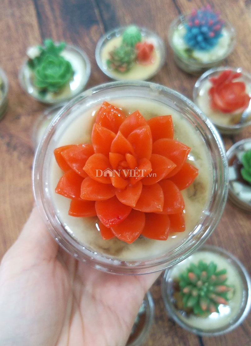 Thạch rau câu là món tráng miệng quen thuộc, yêu thích của nhiều người nhờ hương vị ngọt mát và hình dáng đẹp mắt. Đặc biệt, trong thời gian gần đây, thức ăn này đang thực sự “lột xác” với vô vàn hình thức bắt mắt, rau câu 4D với những nét “chạm trổ” độc đáo… Tiêu biểu trong số đó chính là hình những bông sen đá tuyệt đẹp bằng thạch khiến ai nhìn cũng phải thốt lên: "Ôi giống sen đá thật quá".