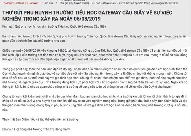 Tối cùng ngày, bà Trần Thị Hồng Hạnh - đại diện trường Gateway - đã có bản tường trình sự việc, đồng thời phía nhà trường cũng đưa ra thông báo tới phụ huynh.