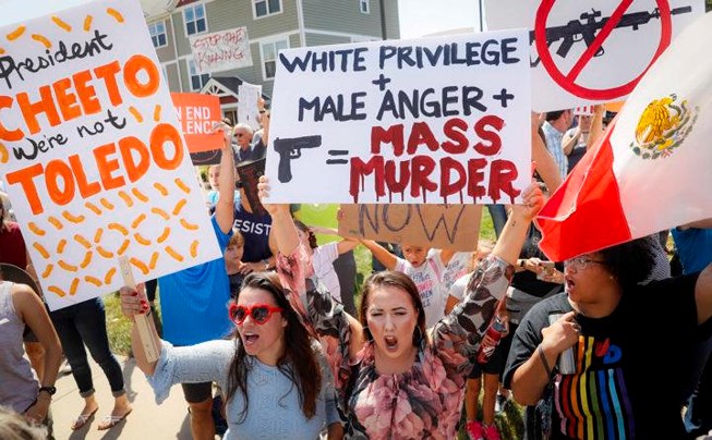 Tổng thống Trump đã đến thăm thành phố bị xả súng. Nhưng hàng trăm người có mặt tại đây để tập trung phản đối chuyến thăm của tổng thống Mỹ. Họ cho rằng tại ông mà xảy ra các vụ xả súng đẫm máu, họ giơ cao khẩu hiệu "Ông Trump phân biệt chủng tộc", "Tình yêu hay thù hận?", "Hãy mang ông ấy về đi"...