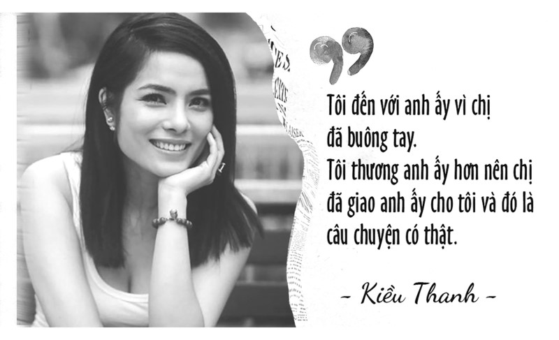 Công chúng giật mình trước khái niệm người thứ ba mới mẻ của Kiều Thanh, đó là không cướp chồng, thậm chí chị đem lại những điều tốt đẹp cho mái ấm mà tự tay chị đang tâm phá vỡ… Kiều Thanh không giấu giếm nói lên tất cả những suy nghĩ từ vị trí của người thứ ba: “Làm người thứ ba mà được vợ cả yêu quý. Tôi mang lại những điều tốt cho người đàn ông của tôi, gia đình nhà chồng cám ơn tôi. Vợ anh ấy cảm ơn tôi”…”Tôi đến với anh ấy vì chị đã buông tay. Tình yêu của chị không đủ lớn để nắm tay anh ấy. Tôi thương anh hơn nên chị đã giao anh cho tôi và đó là câu chuyện có thật. Gần đây, tôi nói chuyện với con trai lớn của anh ấy rằng tôi không cướp bố của con, cũng không cướp chồng của mẹ con. Tôi nói để các con hiểu mình hơn” - Kiều Thanh kể.