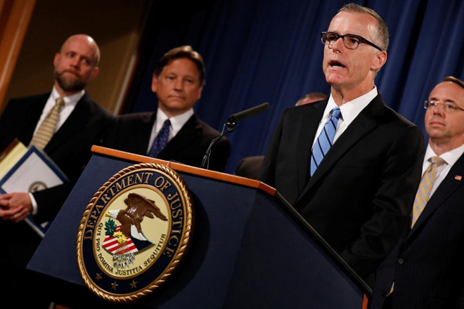 Quyền Giám đốc FBI Andrew McCabe phát biểu trong một cuộc họp báo tại Bộ Tư pháp ở Washington, Mỹ, ngày 20/7/2017. Ảnh: Reuters.