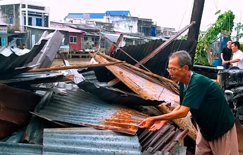 Người dân Cà Mau thu gom mái tôn sau khi lốc xoáy làm sập nhà. Ảnh: Hoàng Hạnh.