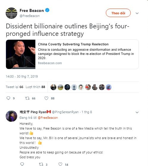 Một tỷ phú Trung Quốc lưu vong gần đây đã tiết lộ với tờ Washington Free Beacon (WFB) rằng chính quyền Trung Quốc đang cố gắng tìm cách ngăn cản Tổng thống Hoa Kỳ Donald Trump tái đắc cử vào năm 2020.