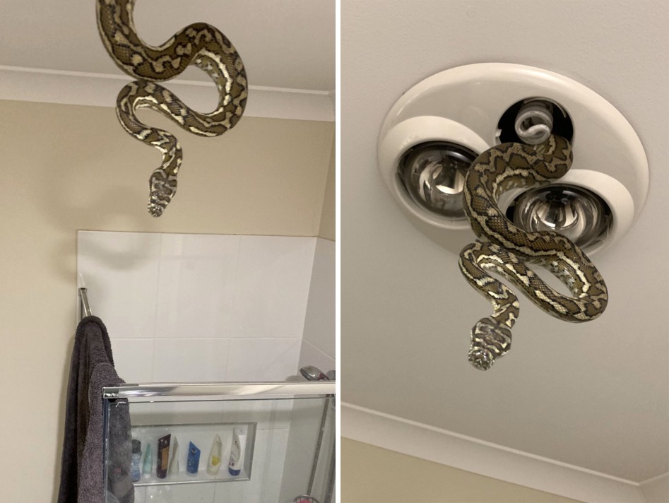 Đang đánh răng mà thấy con vật trên đầu chắc ai cũng hoảng loạn. Lúc đang vệ sinh răng miệng để chuẩn bị đi ngủ, hai đứa trẻ trong một gia đình ở Úc thất kinh khi ngẩng đầu lên và thấy một con trăn lớn cuộn mình trên bóng đèn nhà tắm.