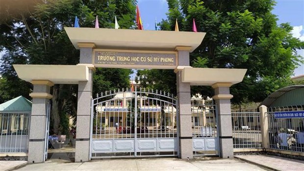 Trường Trung học cơ sở Mỹ Phong, nơi xảy ra sự việc. (Ảnh: Nam Thái/TTXVN)