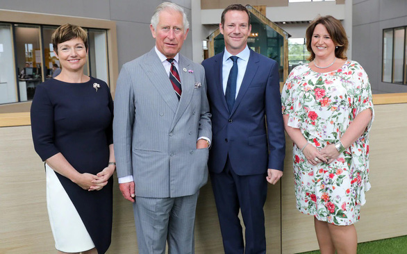 Bà Rachel Clacher (trái) cùng em trai, ông Ed Reeves chụp ảnh cùng Thái tử Charles năm 2017 - Ảnh: TELEGRAPH