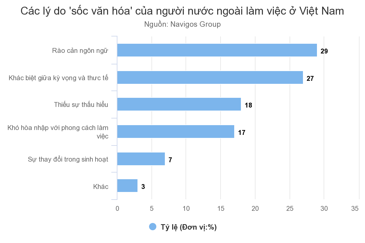 Bên cạnh các thuận lợi, một nửa các ứng viên nước ngoài cảm thấy 'sốc văn hóa' khi đến Việt Nam làm việc. Top 3 các nguyên nhân chính lần lượt là rào cản ngôn ngữ (29%), sự khác biệt giữa kỳ vọng và thực tế (27%) và thiếu sự thấu hiểu (18%).