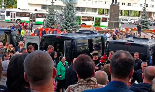 Người dân tập trung tại đám tang của các kỹ sư Nga thiệt mạng trong vụ nổ. Ảnh: AP.