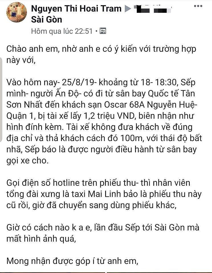 Theo đó người đăng tải thông tin này là chị Nguyễn Thị Hoài Trâm. Cụ thể, khoảng 18h chiều qua, một hành khách người Ấn Độ (sếp chị) có đi taxi gắn nhãn hiệu hãng Mai Linh từ sân bay quốc tế Tân Sơn Nhất đến khách sạn Oscar 68A Nguyễn Huệ, quận 1.