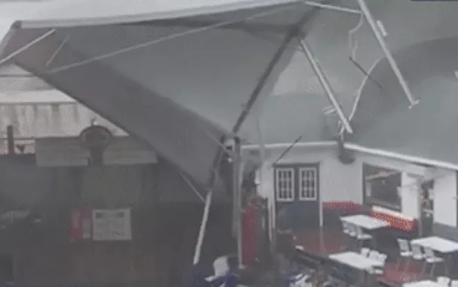 Ở bên kia đường, tại nhà hàng Esso Club, các nhân viên đang cố gắng để bảo vệ một chiếc lều, ngăn gió bão thổi bay lều đi. Chỉ vài giây sau đó, những trận gió mạnh đã hất văng 2 nhân viên lên không trung.