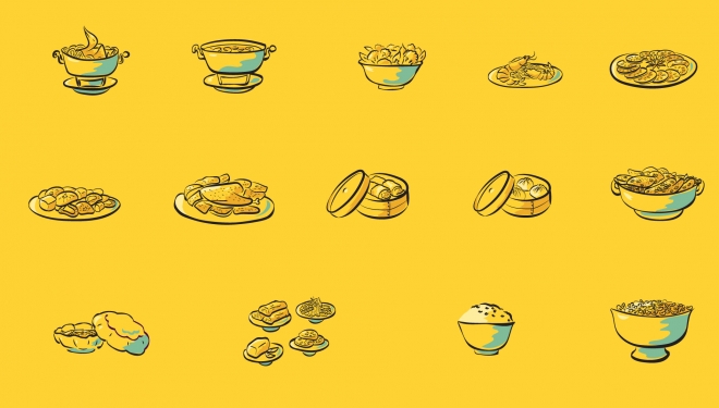 Đây là một bữa sáng mùa hè đầy đủ nhất của Hoàng đế Càn Long (thông thường ông ăn đơn giản hơn). Từ trên cùng bên trái: một món lẩu với yến sào, vịt nướng và thịt nướng, một nồi súp vịt hầm nhừ với khoai mỡ, các món salad thảo mộc, thạch đậu lạnh và vịt hầm với rượu cùng súp lơ, rau bina xào với tôm khô, củ sen hấp với gạo nếp, (hàng thứ hai, từ trái sang) đậu hầm với nấm, gà và vịt thái lát nấu với nước tương, lồng bánh hấp, bánh hấp nhồi với bí ngô băm nhỏ và thịt cừu , gà om với đậu đũa, (hàng thứ ba, từ trái sang) dưa chua, bốn món lạnh trên đĩa ngọc bích, một bát cơm và một bát đậu đũa luộc.
