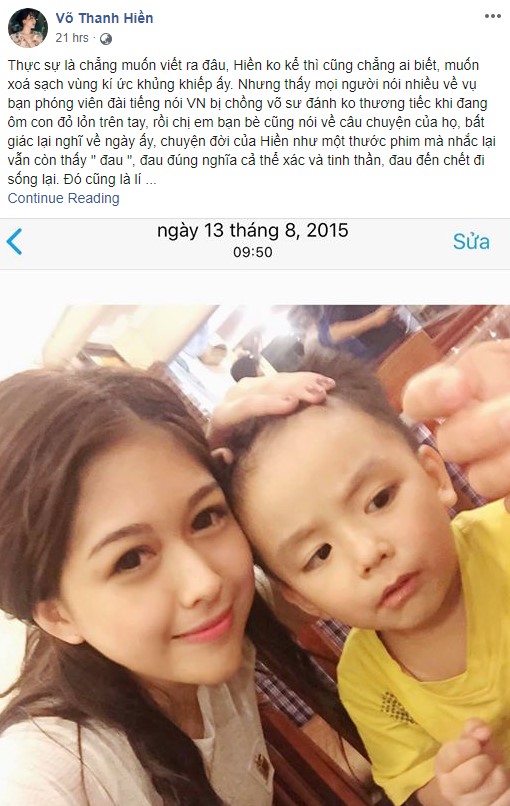 Trong chia sẻ của mình, Võ Thanh Hiền cho biết cô bị đánh từ khi cả hai còn là người yêu, nhưng vẫn kết hôn vì tin mình có thể cảm hóa được. "Mình vẫn quyết nghe theo dù biết tương lai mù mịt. Từ lúc lấy người chồng ấy cho đến khi mang thai, và mới sinh con xong, mình bị đánh như kiếp trước nợ hắn một món nợ phải trả bằng máu".