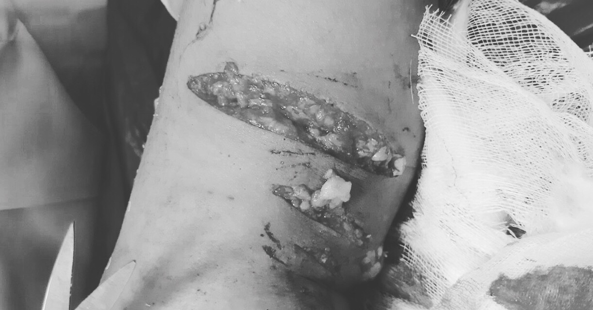 ThS. Bs Nguyễn Đức Lân – Trưởng khoa Ngoại Nhi Tổng hợp là người trực tiếp xử lý cắt lọc và khâu vết thương cho biết, Đ. bị vết thương bắp chân trái 10x10 cm, lộ gân cơ cẳng chân trái, tổng số gần 30 vết thương trong đó nghiêm trọng nhất là vết thương gối phải (dài 5cm) và cùng nhiều vết thường nhỏ dài khoảng 2-3cm.