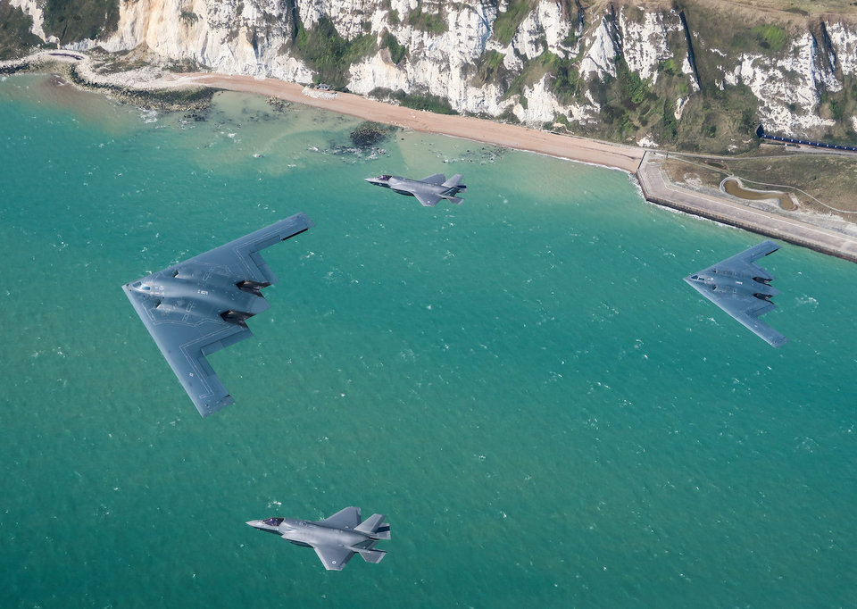 Hình ảnh ghi lại khoảnh khắc máy bay ném bom tàng hình B-2 Spirit của Không quân Mỹ sánh đôi cùng chiến đấu cơ F-35B của Không quân Anh bay lượn trên bầu trời Dover, tham gia vào một nhiệm vụ huấn luyện bất thường, bởi chiếcmáy bay ném bom tàng hình B-2 Spirit này khiến Mỹ vốn luôn được Mỹ giữ bí mật ở mức độ cao .
