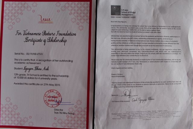 Giấy chứng nhận học bổng toàn phần của TH School trị giá hơn 1,4 tỷ đồng (bên trái) và hơn 5 tỷ đồnghọc bổng của trường đại học danh tiếng Australia - SP Jain School of Global Mana (bên phải). (Ảnh NVCC)