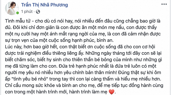 Trước đó, sau một thời gian dài giữ bí mật, thông qua một bài viết được chính nữ diễn viên chia sẻ trên trang cá nhân, Nhã Phương lần đầu công khai thông tin đã sinh con gái.