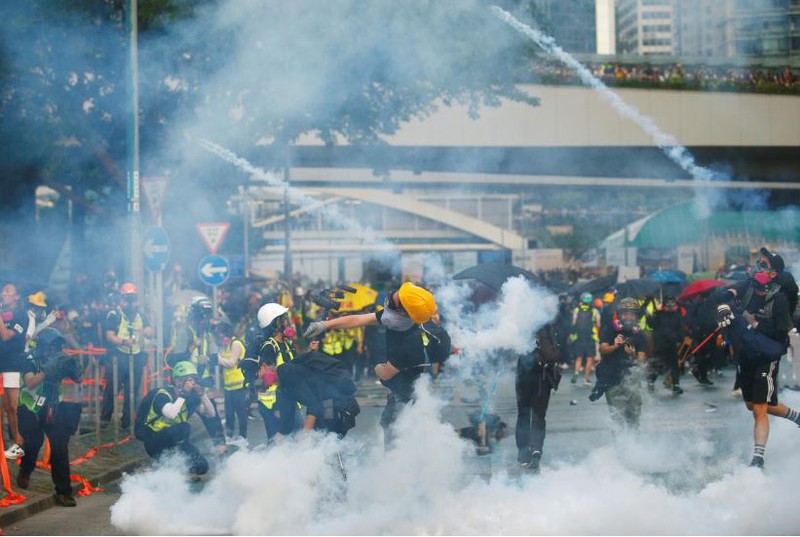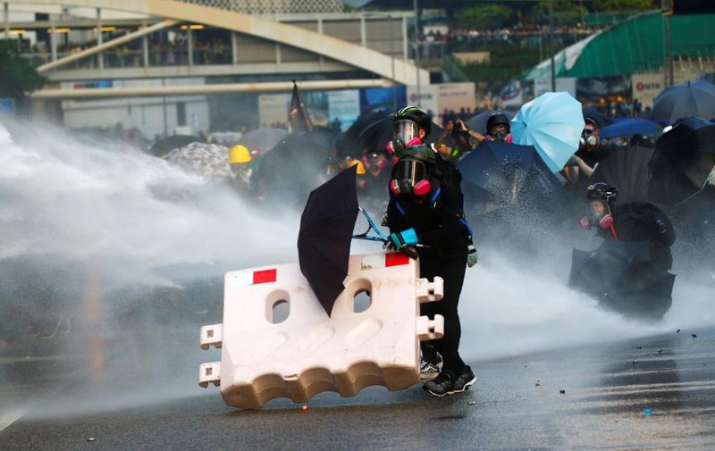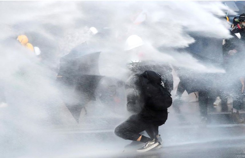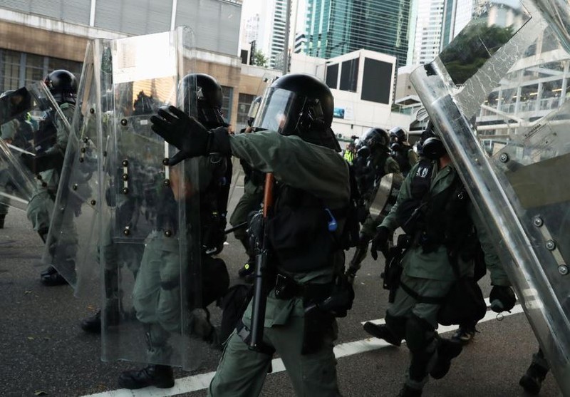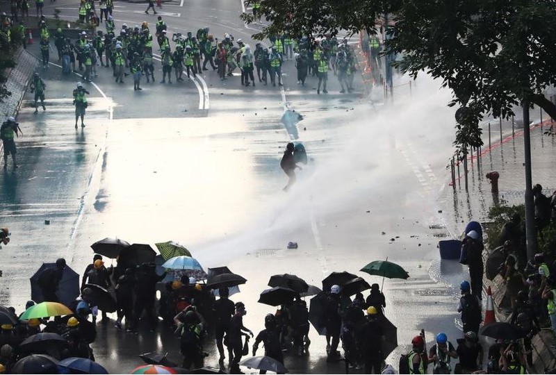 Cảnh sát sử dụng đạn cay và vòi rồng đối phó biểu tình. Theo SCMP, tối 15-9 có hai xe bọc thép xuất hiện trên đường phố Hong Kong.