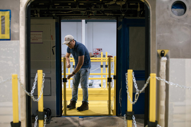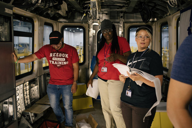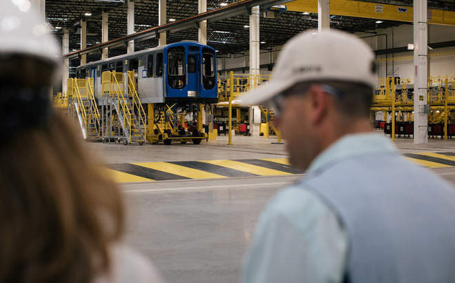 Giám đốc sản xuất của nhà máy CRRC Chicago đi thăm nhà máy. CRRC đã nhận được hợp đồng sản xuất 846 toa xe cho tuyến tàu điện ngầm địa phương. Ảnh: NYT