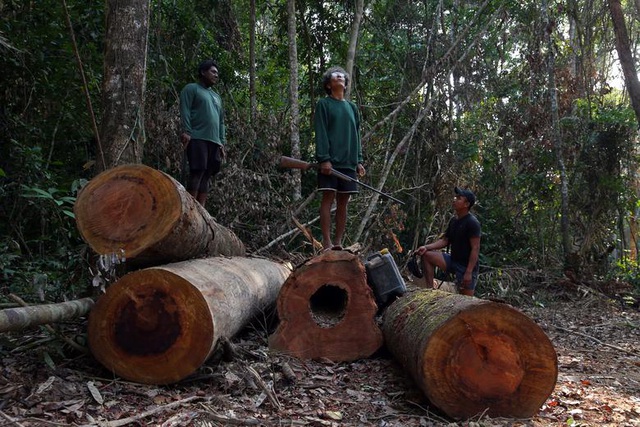 Người bản địa Kayapo đứng trên các khúc gỗ bị những tên lâm tặc bỏ lại ở vùng Bau, gần Novo Progresso, bang Para, Brazil ngày 13/9. Các thổ dân cho biết họ thực hiện vệc tuần tra khu rừng 3 tuần trước và những đối tượng nói trên đã bỏ đi. Vào tháng 8, một thống kê của cơ quan vũ trụ Brazil cho biết số vụ cháy ở Amazon năm nay cao nhất kể từ năm 2010. Tỉ lệ phá rừng cũng đã tăng 4 tháng liên tiếp vào tháng 8 so với cùng kỳ năm ngoái.