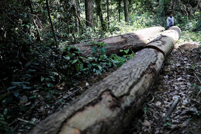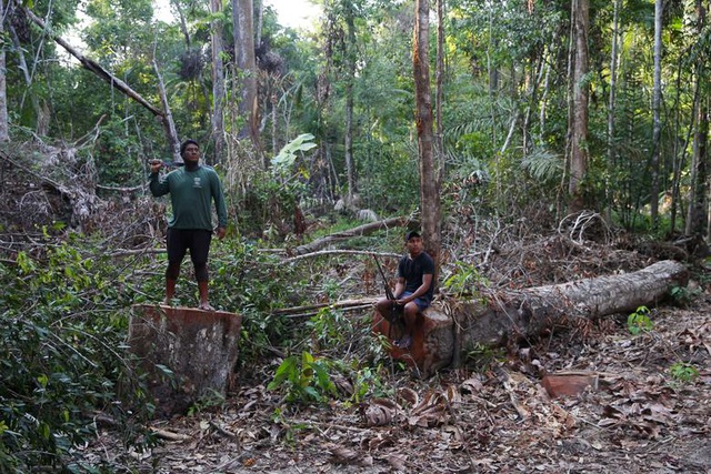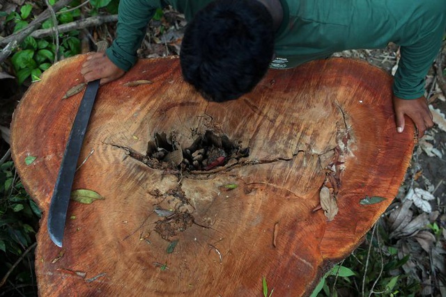 Một người đàn ông thổ dân Kayapo quan sát thân cây, nơi những người khai thác gỗ trái phép đã xâm nhập và phá rừng ở khu vực Bau. Nỗ lực bảo tồn rừng của Brazil đã thu hút sự chú ý trong năm nay khi Tổng thống theo hướng cực hữu Jair Bolsonaro kêu gọi giảm bớt các quy tắc bảo tồn rừng để ưu tiên phát triển kinh tế thông qua khai thác tài nguyên thiên nhiên.