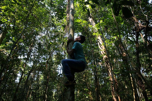 Một thanh niên tộc Kayabi trèo cây để thu hoạch quả akai (một loại cọ ở Nam Mỹ có quả màu tím ăn được). Từ nhiều đời nay, Amazon là nơi ở, duy trì cuộc sống của nhiều thổ dân. Mất đi rừng Amazon ảnh hưởng trực tiếp tới chất lượng cuộc sống của họ.