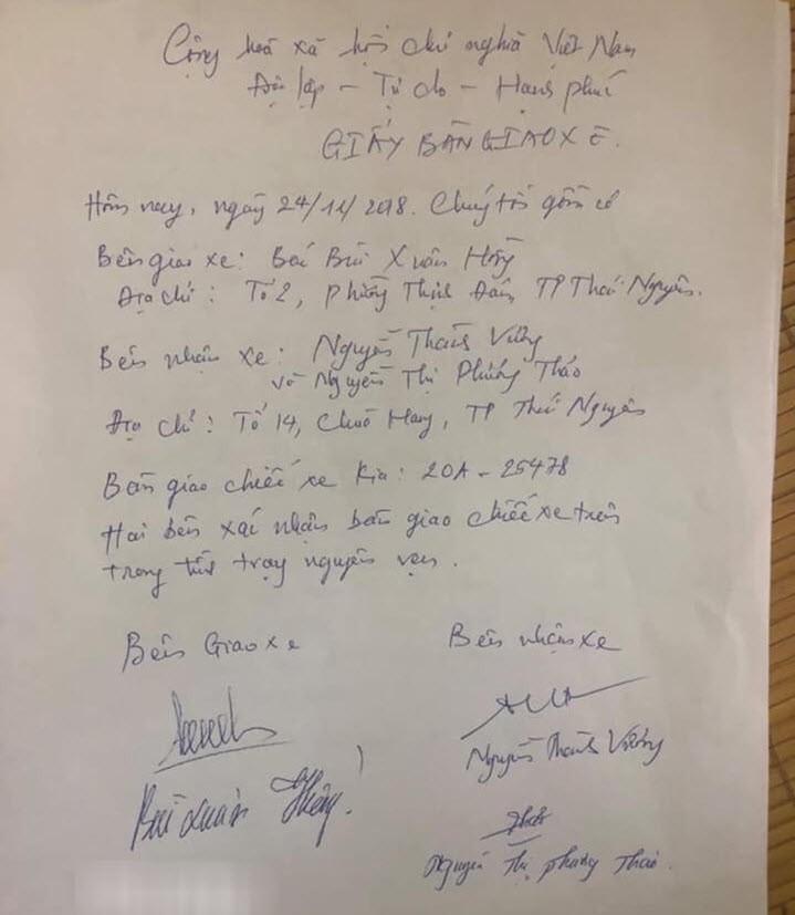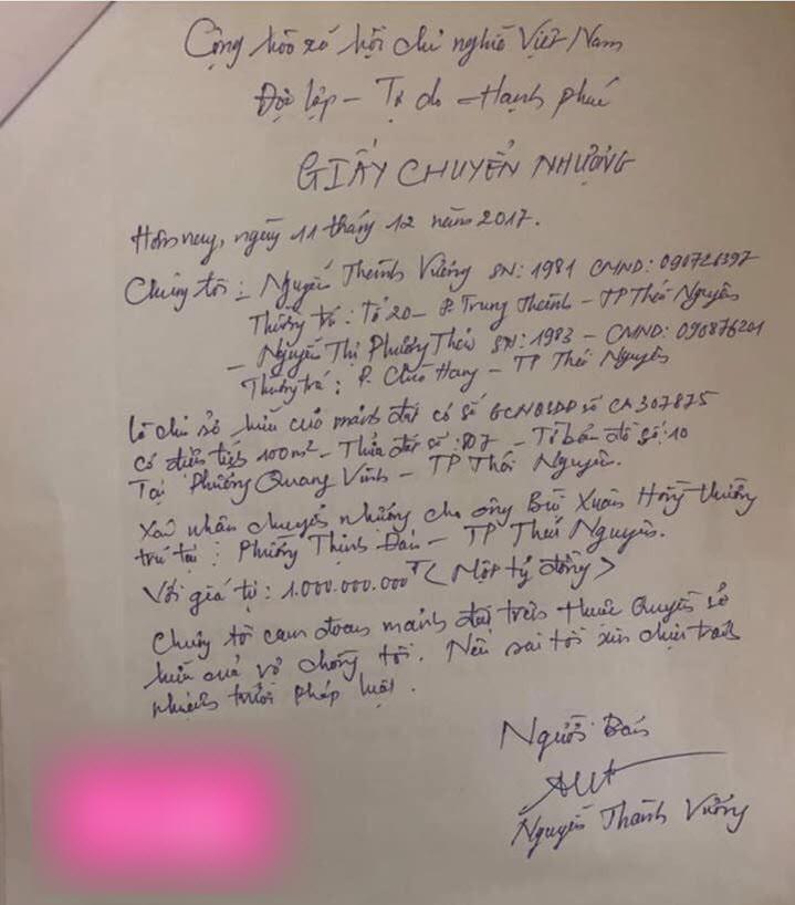 Cụ thể hơn, ngày 11.12.2017, Thảo - Vương đă viết giấy chuyển nhượng mảnh đất 100m2 ở phường Quang Vinh, TP Thái Nguyên cho ông Hồng với giá 1 tỉ đồng (lúc đó b́a đỏ đang ở trong ngân hàng) để trả nợ khoản vay 3 tỉ đồng. Vương kư tên vào giấy này. Đây là mảnh đất mà Thảo – Vương vay ngân hàng 850 triệu đồng để mua lại. Song sau đó, cả hai lại âm thầm bán cho người khác với lư do... trả nợ ngân hàng. Ngày 23.11.2018, Thảo - Vương viết giấy xác nhận với ông Hồng rằng bán đất 1 tỉ cho người khác.