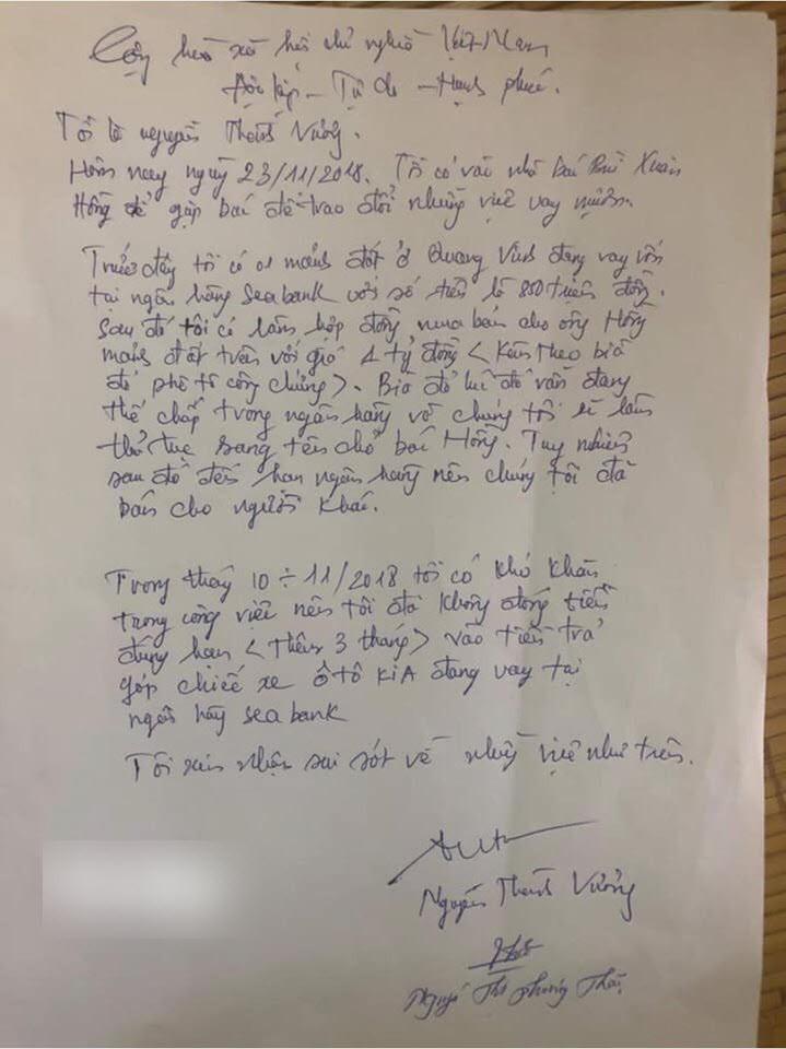 Chưa hết, Thảo - Vương còn mua một chiếc ô tô trả góp và đến ngày 24.11.2018 đã viết giấy bàn giao xe cho ông Hồng như trừ vào khoản vay 3 tỉ đồng. Dẫu vậy, ô tô vẫn đứng tên Thảo – Vương. Tiền vay ngân hàng mua ô tô, hai vợ chồng này trả hằng tháng. Mấy tháng sau, Thảo - Vương mượn ô tô chạy nhưng không trả lại cho ông Hồng. Lúc ông Hồng sang nhà lấy chìa khoá ô tô mang về thì họ kiện với công an và vu khống chú ăn trộm?! Người thân cho biết ông Hồng phải lên trụ sở công an viết bản tường trình và giao lại ô tô cho đôi vợ chồng gian manh. Song, thông tin này đang được kiểm chứng.