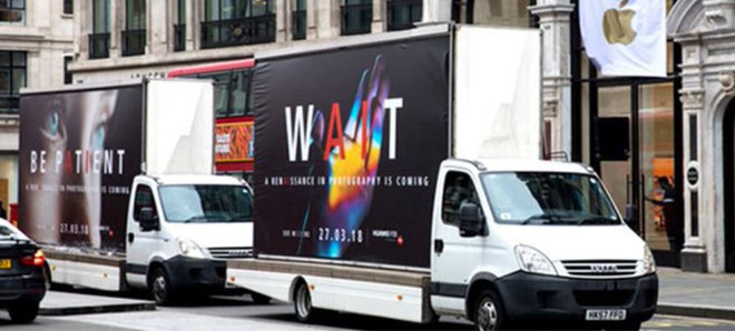 Xe tải quảng cáo cho dòng Huawei P20 đỗ trước cửa hàng Apple tại Anh năm 2018. Ảnh: Bandt.