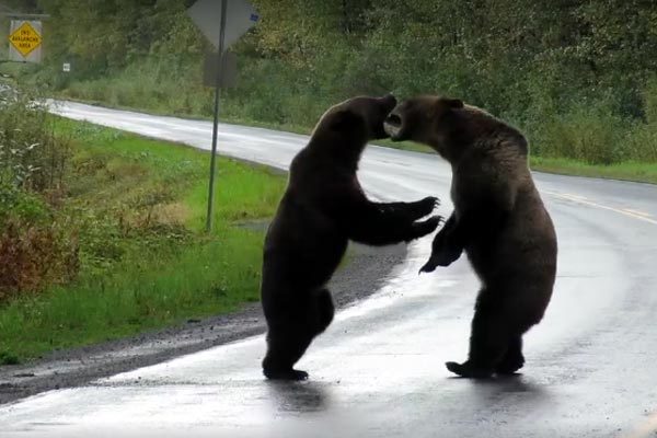Một tài xế ở Canada khi đang di chuyển trên đường cao tốc đã phát hoảng khi chứng kiến một cặp gấu "khủng" đang so găng ngay phía trước mặt.