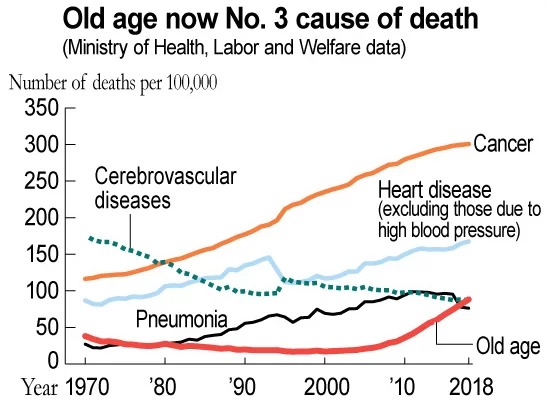 Tờ The Asahi Shimbun đưa tin, ngày càng nhiều người Nhật "chết tự nhiên" do tuổi già, đây hiện được xếp là nguyên nhân thứ ba gây tử vong sau ung thư và tim mạch, theo thống kê của Bộ Y Tế.