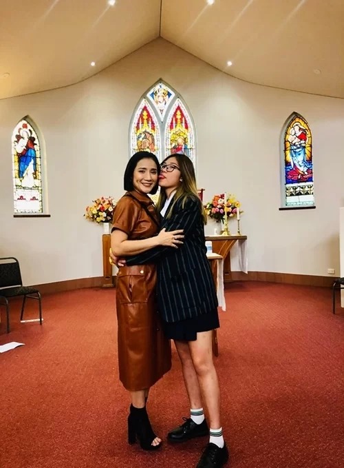 Nữ diễn viên - MC mặc trang phục trẻ trung, xuất hiện ở Ballina, New South Wales, để chứng kiến ngày vui của con. Chị bay sang Australia hôm 24/9 và chỉ ở lại hai ngày vì bận công việc ở Việt Nam. "Bà mối" của chương trình "Bạn muốn hẹn hò" cảm nhận Tường An trưởng thành hơn sau ba năm học tập ở nước ngoài. Sau khi tốt nghiệp, An sẽ trải qua một số bài kiểm tra trước khi bước vào ngưỡng cửa đại học.