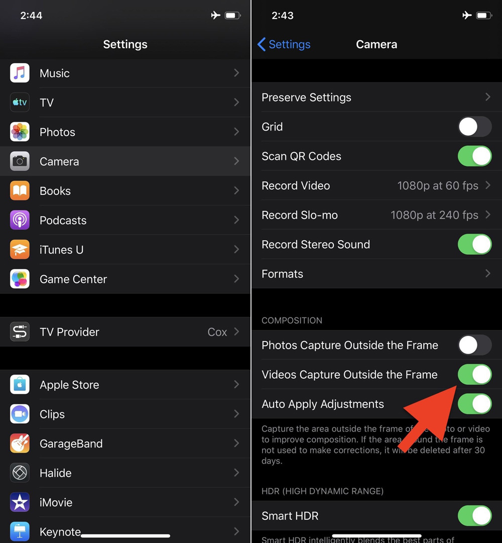 Để thực hiện, bạn truy cập vào Settings > Camera > tắt công tắc bên cạnh dòng chữ Video Captured Outsite the Frame.