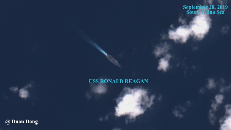 Tàu sân bay USS Ronald Reagan di chuyển một mình lúc bị 7 tàu Trung Quốc bao vây. Đây là điều không thườn xảy ra vì thông thường tàu USS Ronald Reagan luôn có các tàu chiến khác của Mỹ tháp tùng. Hình ảnh vệ tinh này nhanh chóng lan truyền qua các trang mạng xã hội khác, như Twitter.