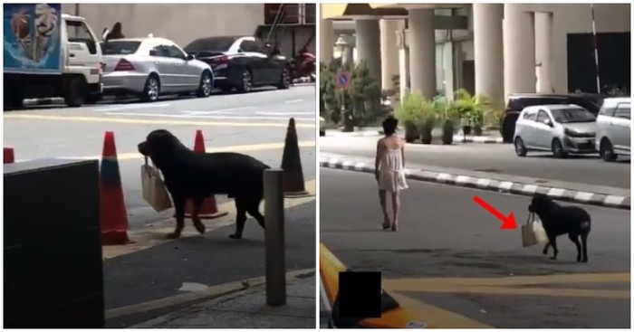 Một đoạn video quay cảnh một chú chó giống Rottweiler ngậm túi xách cho chủ được đăng tải trên Twitter của người phụ nữ sống tại tỉnh Bukit Bintang, Malaysia, những bí kíp trên là hoàn toàn không cần thiết, bởi chú chó giống Rottweiler của cô sẽ thay cô cầm túi xách.