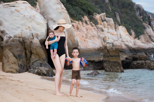 Chân dài 9X diện áo tắm khoe đường cong gợi cảm khi dắt hai con trai đi dạo biển.
