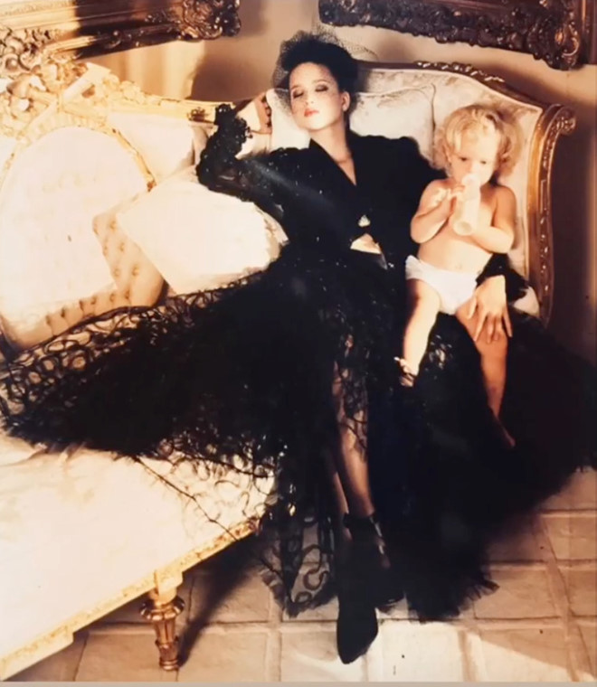 Trong bức ảnh, Ivanka ăn mặc lộng lẫy với váy ren đen diêm dúa và mạng che mặt. Cô bế em gái Tiffany mặc tã lót đang tu bình sữa trong lòng.