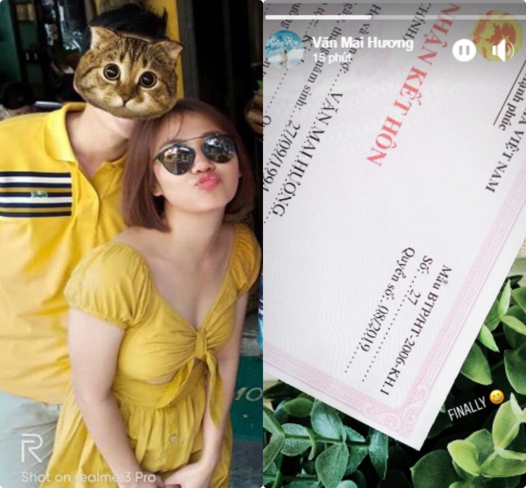 Cách đây ít phút, Văn Mai Hương bất ngờ cập nhật hình ảnh chụp giấy chứng nhận kết hôn thông qua tính năng story trên facebook. Trong hình ảnh của nữ ca sĩ đăng tải có ghi rõ tên người sở hữu giấy kết hôn là Văn Mai Hương. Ngày sinh trong giấy chứng nhận kết hôn này cũng trùng khớp với ngày sinh 27/9/1994 của nữ ca sĩ khiến cư dân mạng không khỏi ngỡ ngàng.