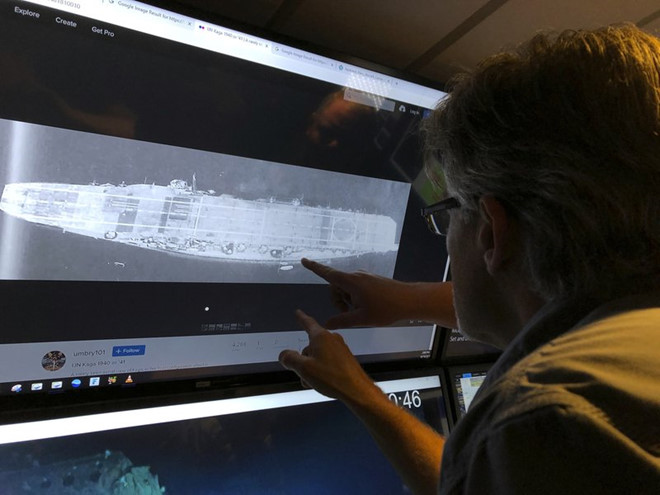 Tàu nghiên cứu Petrel đã phát hiện ra tàu sân bay Kaga của Nhật Bản sau khi tung robot thám hiểm dưới nước vào vị trí cách đảo san hô Midway hàng trăm dặm. Ảnh: AP.