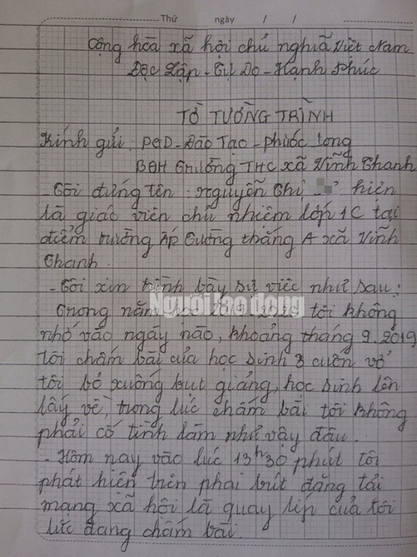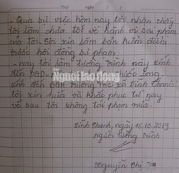 Vừa qua, báo chí đăng tải hình ảnh chụp lại bản tường trình của cô N.T.T., về việc ném vở học sinh (Trường tiểu học C Vĩnh Thanh, xã Vĩnh Thanh, huyện Phước Long, tỉnh Bạc Liêu) khiến nhiều người chỉ biết lắc đầu ngao ngán.