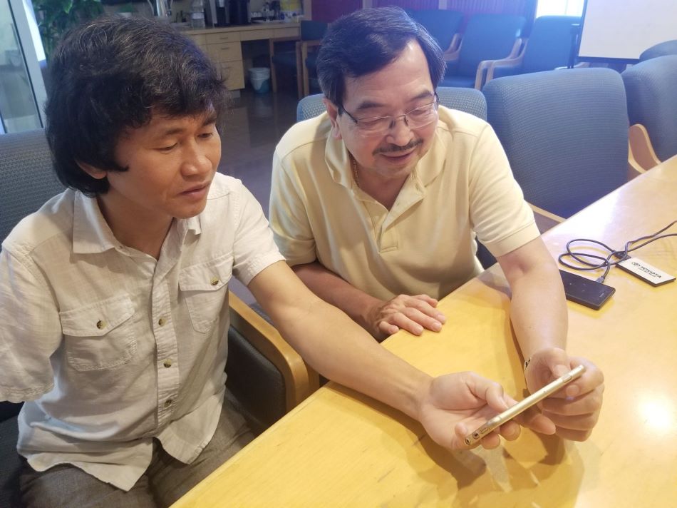 Anh Nguyễn Thế Vinh (trái) và cựu Thiếu Úy Nguyễn Tuấn Khanh, người chứng kiến trận pháo kích Tiền Đồn 5 vào Tháng Sáu, 1974. (Hình: Ngọc Lan/Người Việt)