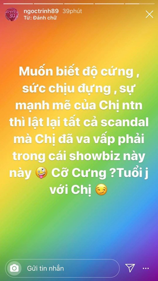 Mới đây, trên trang cá nhân của mình, "nữ hoàng nội y" Ngọc Trinh đã bất ngờ đăng tải dòng trạng thái mỉa mai một nhân vật nào đó chưa được tiết lộ. Cô viết: "Muốn biết độ cứng, sức chịu đựng, sự mạnh mẽ của chị như thế nào thì lật lại tất cả scandal mà chị đã vấp phải trong cái showbiz này này. Cỡ cưng? Tuổi gì với chị".