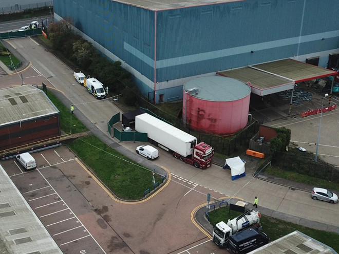 Vụ phát hiện 39 thi thể trong thùng xe tải tại khu công nghiệp vùng Essex, Anh ngày 23/10 là một trong những bi kịch tồi tệ nhất mà nạn buôn người gây ra trong lịch sử Anh, theo AP. Ảnh: Splash News.
