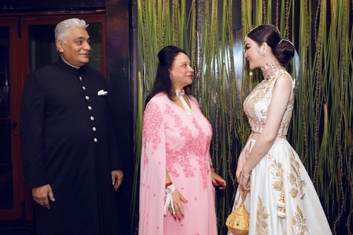 Lý Nhã Kỳ (phải) diện váy thêu chỉ vàng dự sinh nhật đại gia Ấn Độ ở Mumbai ngày 12/8. Ảnh:LNK.