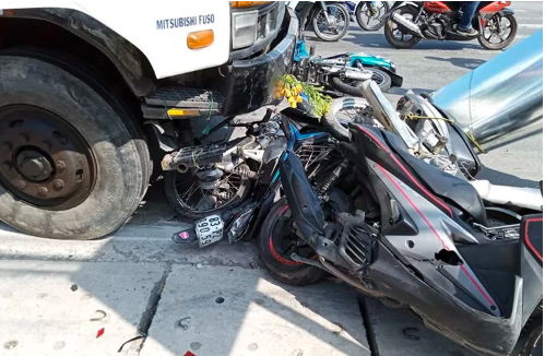 Tại hiện trường, một xe máy bị kéo lê nằm dưới gầm xe tải bị biến dạng hoàn toàn, nhiều chiếc khác nằm la liệt trước đầu xe tải cũng bị hư hại nặng phần đầu, đồ đạc trên các xe máy vương vãi ra đường.