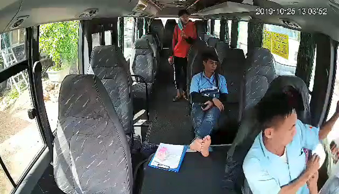 Khi xe xuất bến, có nữ hành khách mặc áo đỏ lên xe và ngồi ở hàng ghế sau lưng lái xe. Xe búyt vừa di chuyển một đoạn thì bất ngờ bị xe khách hãng Tuấn Hùng BKS: 73B - 00698 lao lên phía trước chặn đầu, ép vào lề đường.