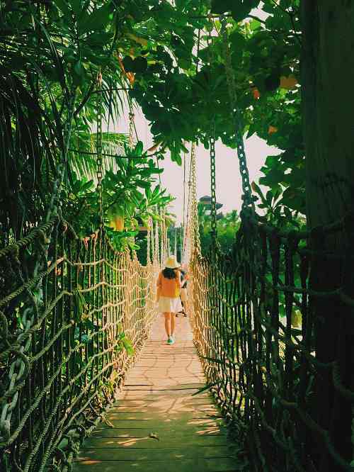 Vườn rộng, hoa cỏ thênh thang, cây cối xanh tươi, nhưng… chưa hết đâu! Ở trung tâm mũi phía Nam của đảo Sentosa, bãi biển Palawan khéo léo hòa trộn biển xanh - cát trắng - trời xanh - nắng vàng và một chiếc cầu treo dẫn du khách sang một hòn đảo nhỏ.