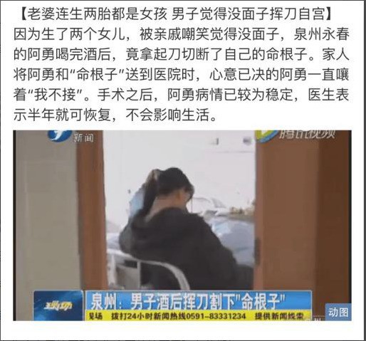 Tháng 2/2016, khoa cấp cứu bệnh viện Tuyền Châu, Phúc Kiến đã nhận một ca cấp cứu nghiêm trọng khi một người đàn ông tên Dũng (tên được thay đổi), 36 tuổi, đã tự lấy dao chặt đứt “của quý” của mình.
